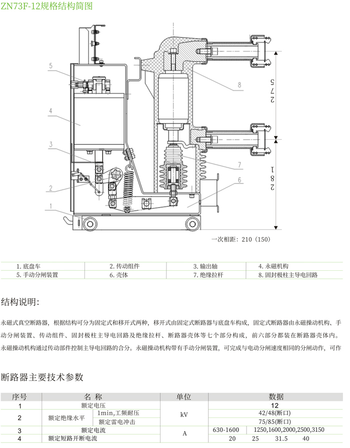 ZN73F-12型永磁機(jī)構(gòu)戶內(nèi)高壓真空斷路器是我公司通過(guò)總結(jié)多年來(lái)積累的豐富的現(xiàn)場(chǎng)經(jīng)驗(yàn),本著安全可靠、長(zhǎng)壽命、少維護(hù)的設(shè)計(jì)理念,憑借雄厚的技術(shù)實(shí)力自主研發(fā)的新一代高壓真空斷路器。