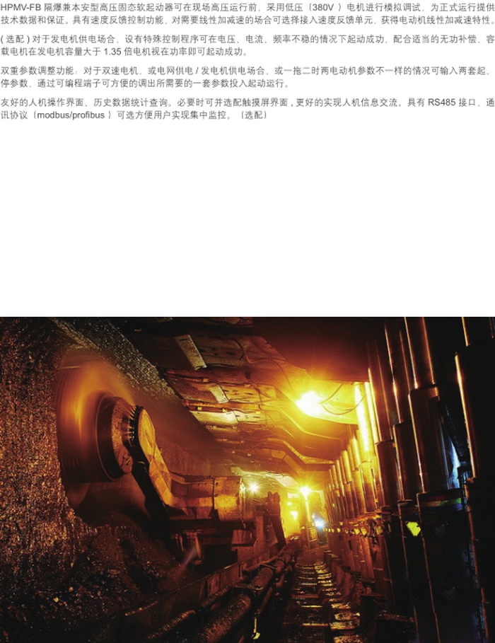 HPMV-FB系列礦用隔爆兼本質(zhì)安全型高壓交流軟起動(dòng)器具有多種起動(dòng)方式、控制功能和完善的電機(jī)綜合保護(hù)功能。消除了機(jī)械及電流沖擊,延長(zhǎng)了設(shè)備使用壽命,提高礦用設(shè)備的穩(wěn)定性、安全性。主要適用于煤礦礦井下和其他周?chē)橘|(zhì)中含有甲烷及煤塵混合物的爆炸性氣體及條件惡劣的特殊環(huán)境中。